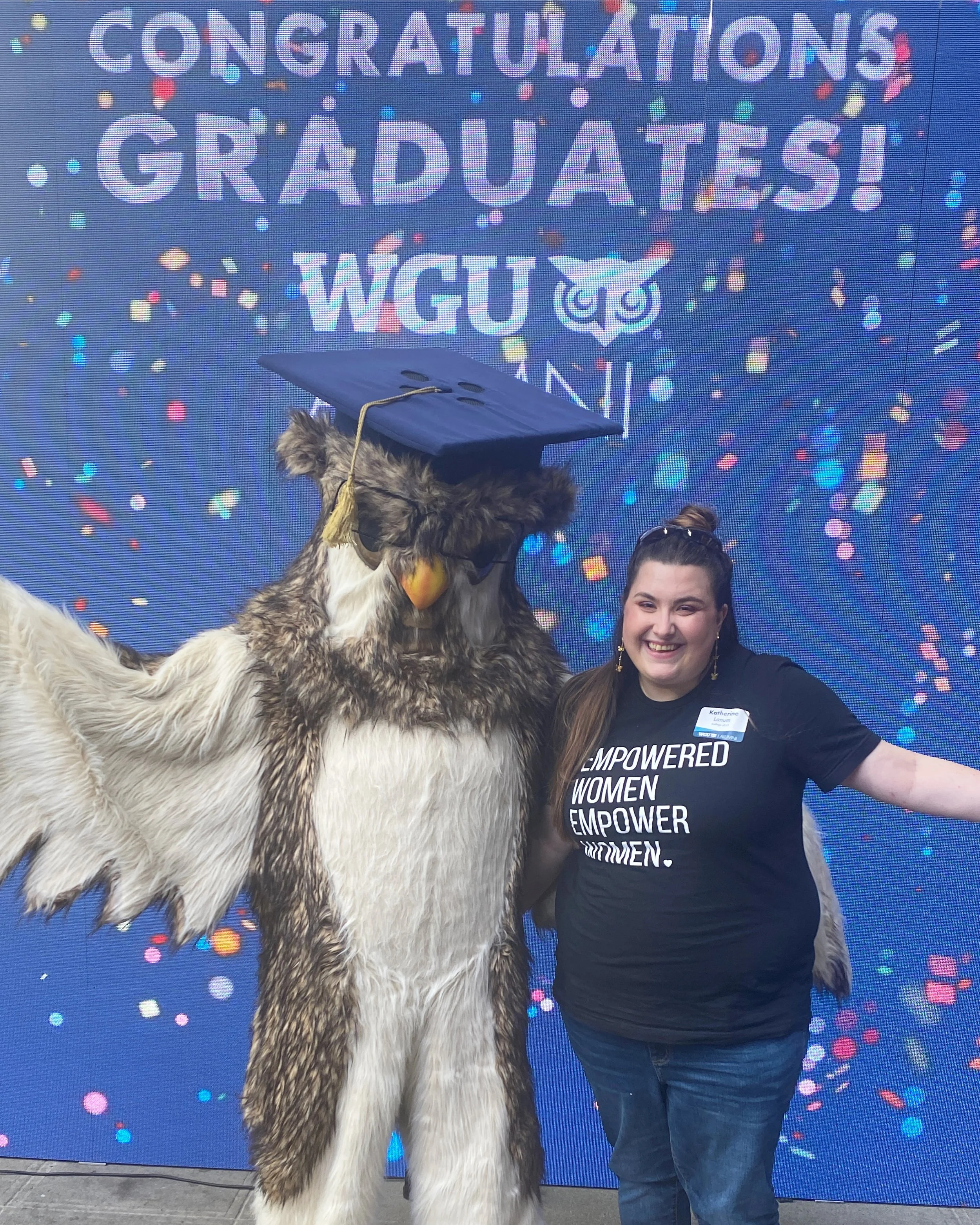 Me, standing next to the WGU mascot Sage, at a graduation celebration.