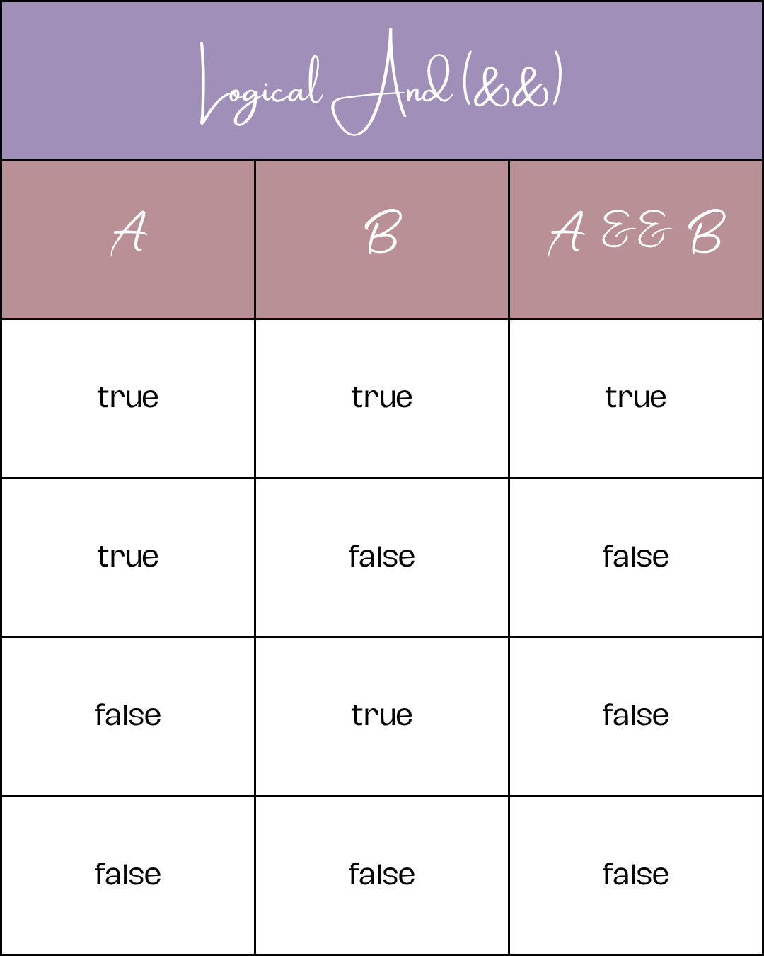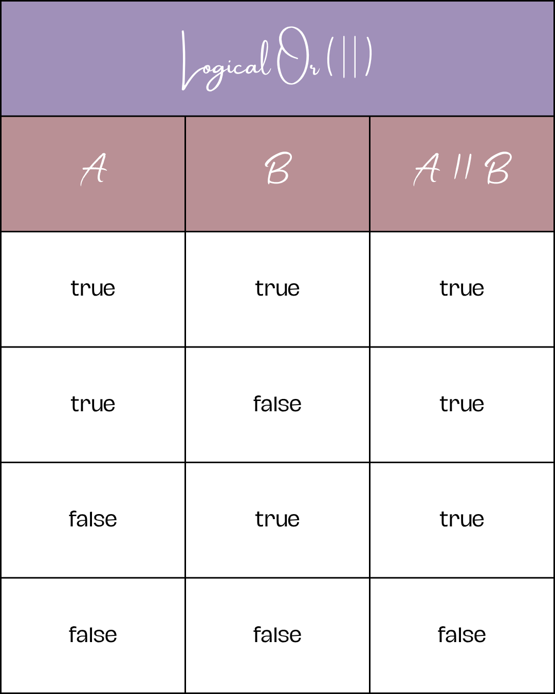 &&(AND): Both conditions must be true.||(OR): At least one condition must be true.!(NOT): Reverses the boolean value.